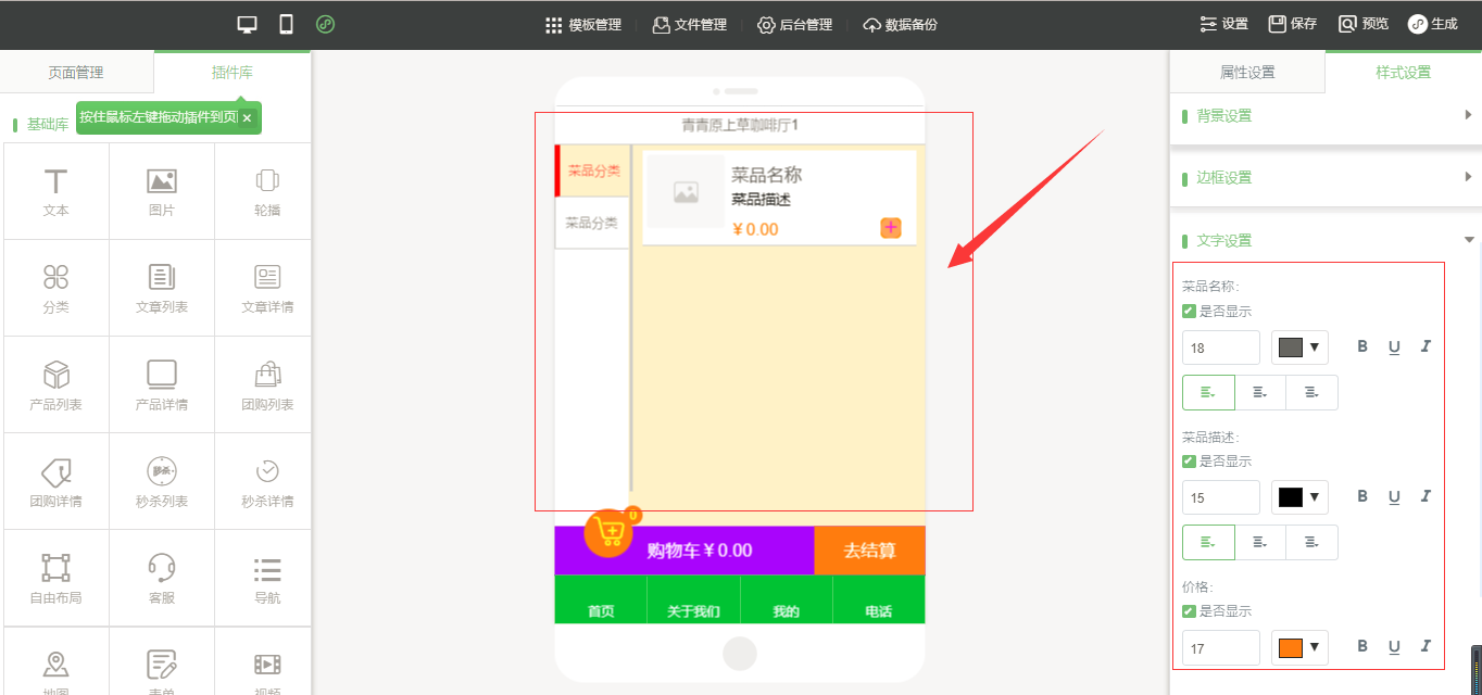 3.在小程序编辑器中,拖入插件“手机点单”,该插件为内页插件,我们可以在页面中给小程序页面进行布局,然后点击“开始点单”按钮进行属性及样式设置,由于需要店面的准确定位,因此需要申请地图的API密钥,具体操作可以看帮助文档,在样式设置中,“背景设置”与“边框设置”是全局设置,是针对该小程序插件页面的整体设置,“按钮样式”则是仅针对于“手机点单”入口按钮的设置;“列表(页面)设置”是针对该菜品列表页的设置,里面的“文字设置”中可以设置需要的显示项,设置完成之后点击保存即可(注:当后台没有添加任何数据时,该列表页中会出现一组假的数据,仅供参考使用,当后台添加数据之后,该列表会自动换成真实数据),如图所示: